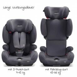 Von 9 -25 kg (ab 9 Monaten) wird Dein Kind mit dem 5-Punkt-Gurt angeschnallt. Ab 15 -36 kg wird Dein Kind mit dem fahrzeugeigenen 3-Punkt-Gurt angeschnallt.