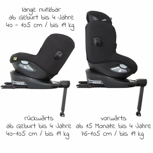 - Lange Nutzungsdauer, lรคnger rรผckwรคrtsgerichtet fahren: rรผckwรคrtsgerichtet ab Geburt bis ca. 4 Jahre 40 – 105 cm, (max. 19 kg); vorwรคrtsgerichtet ab 15 Monate bis ca. 4 Jahre 76 โ 105 cm (max. 19 kg) mรถglich