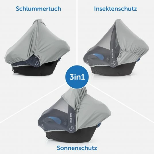Das 3in1 Premium-Verdeck für Babyschalen – Grau von Zamboo ist Sonnensegel, Abdunkelung und Fliegennetz in Einem. Es passt auf fast alle Babyschalen der Gruppe 0+ mit Tragebügel und wird einfach per Gummizug übergespannt. So ist Dein Baby im nächsten Sommer Urlaub bestens vor Sonne und Insekten geschützt. Anders als ein Sonnenschirm, bleibt das Sonnentuch stets auf seiner Position.